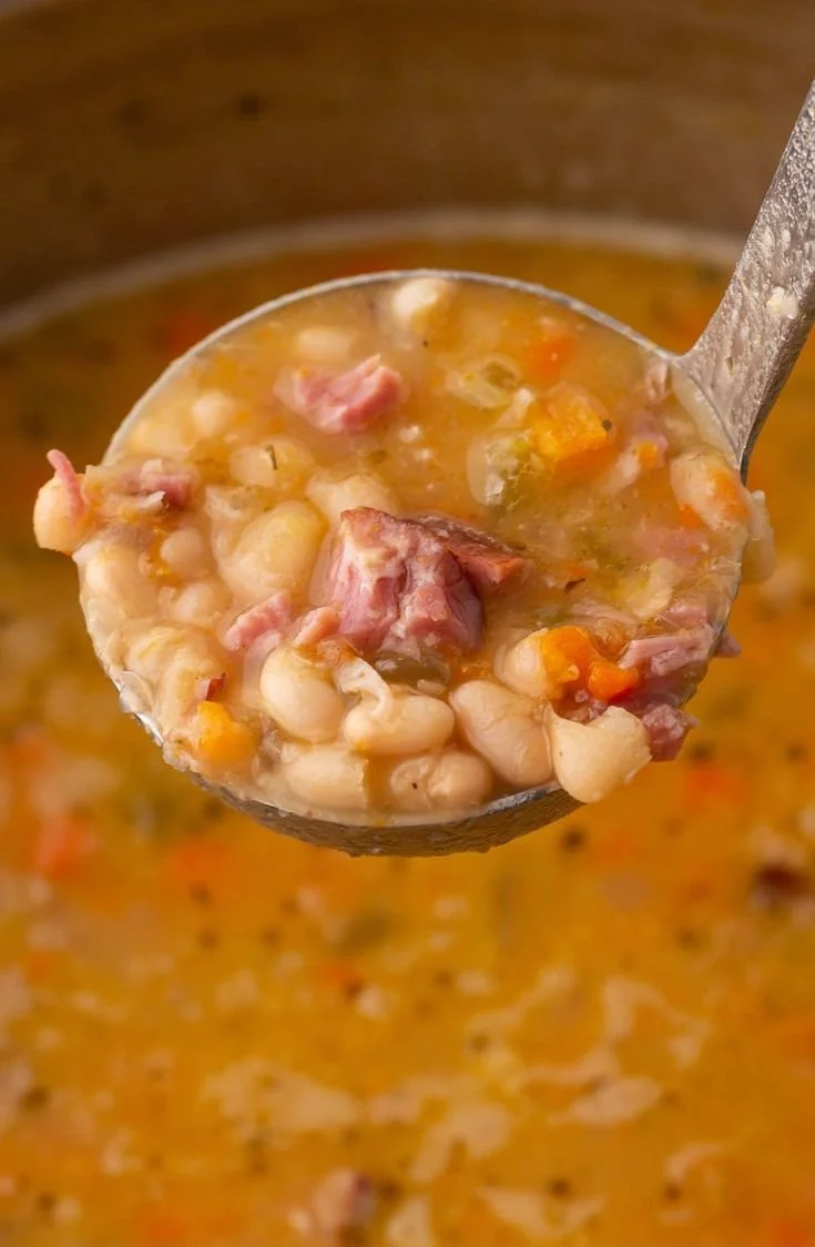۞Add in a couple cans of white navy beans or pinto beans. I used dry beans soaked in salt water for 6 hours, drained and pressure cooked them in my instapot in some of the ham broth for 16 minutes.